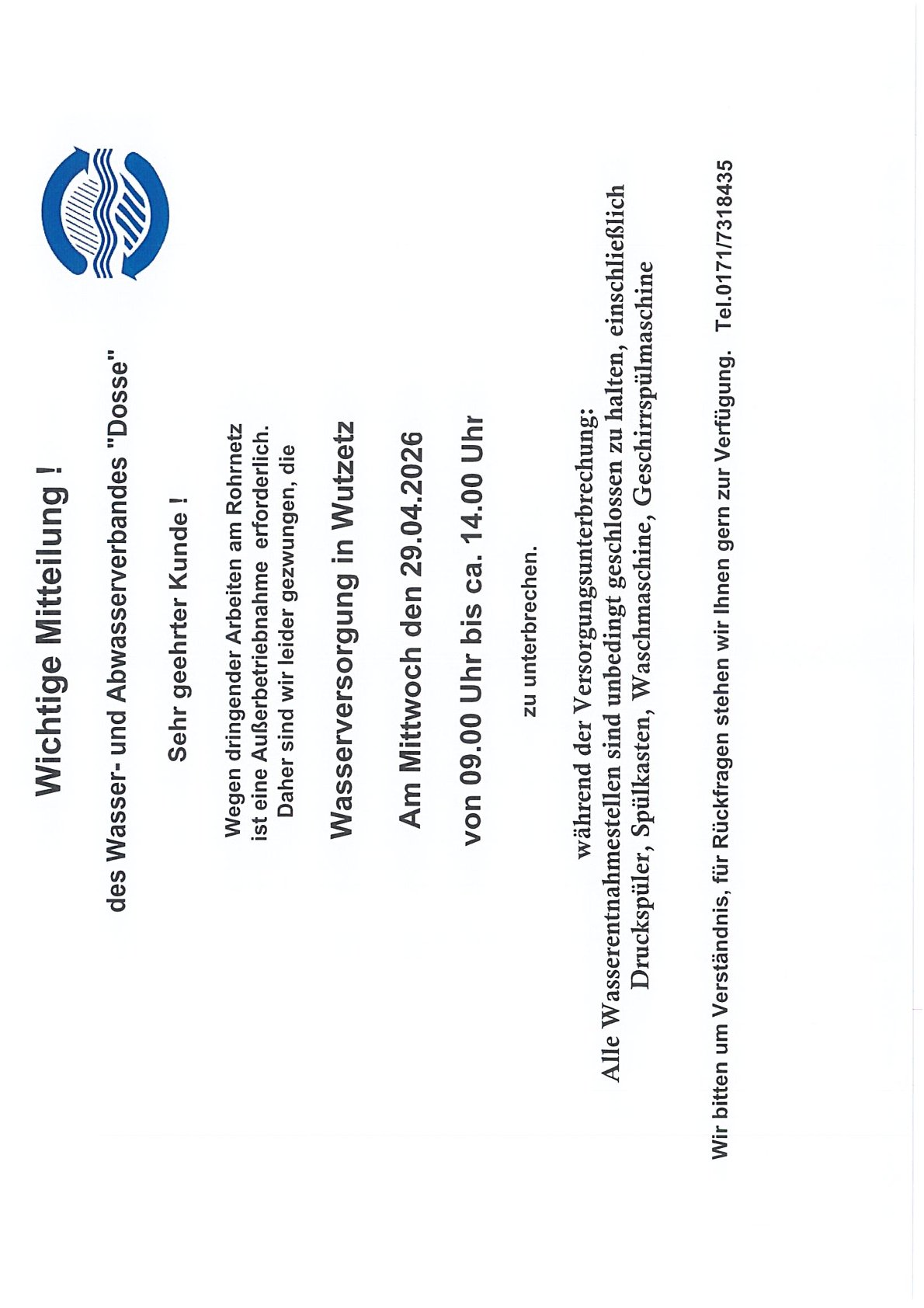 Aufgrund von notwendigen Arbeiten im Bereich des "WAZV Dosse" muss die Trinkwasserversorgung in Friesack OT Wutzetz am 29.04.2026 zwischen 09.00 und 14.00 Uhr eingestellt werden. Weitere Details entnehmen Sie bitte der Information des WAZV.